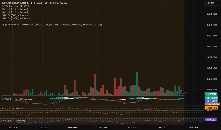 Quickly see the trend direction of your top four stocks using a customizable EMA. Each stock shows as a colored tile: green if price is above the EMA, red if below. A summary label shows whether all four stocks are trending up, down, or mixed.
