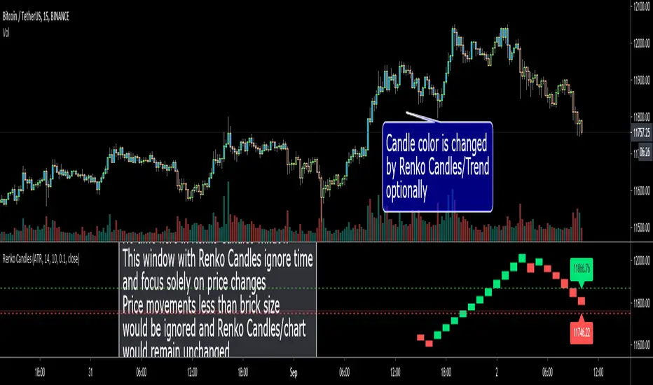 This scripts draws Renko Candles in a seperate window dynamically and live. it shows only last 20 Renko candles. there is no time in that window, that means this window with Renko candles ignore time and focus solely on price changes. For Example If the brick value is set at 10 points, a move of 10 points or more is required to draw another brick. Price movements less than 10 points would be ignored and the Renko chart would remain unchanged. If you don't know what Renko Chart/Candle is then you should read some articles about it ;)