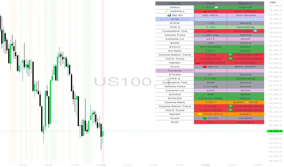 This comprehensive Market Internals Dashboard monitors real-time NYSE and NASDAQ market breadth indicators to help traders identify: