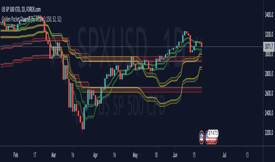 The indicator plots the golden pocket ( Fibonacci retracement 61% to 65%) of recent highs and lows. The golden pocket is calculated from the last high to the last low. The high and low are determined by the number of last bars. The golden pocket is used for trading as support and resistance .