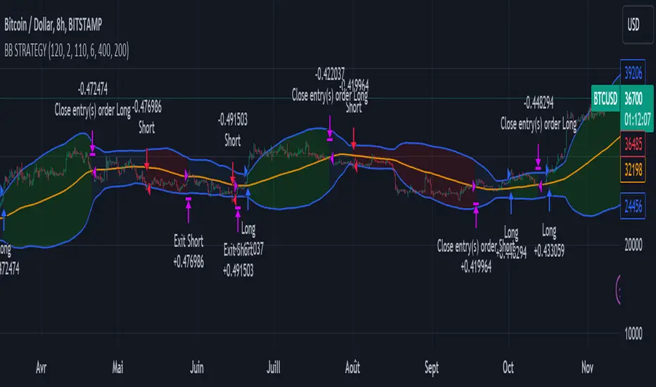 This strategy is based on the famous Bollinger Bands. These are constructed using a standard moving average (SMA) and the standard deviation of past prices. The theory goes that 90% of the time, the price is contained between these two bands. If it were to break out, this would mean either a reversal or a continuation. However, when a reversal occurs, the movement is weak, whereas when a continuation occurs, the movement is substantial and profits can be interesting. We're going to use BB to take advantage of this strong upcoming movement, while managing our risks reasonably. There's also a money management method for reinvesting part of the profits or reducing the size of orders in the event of substantial losses.