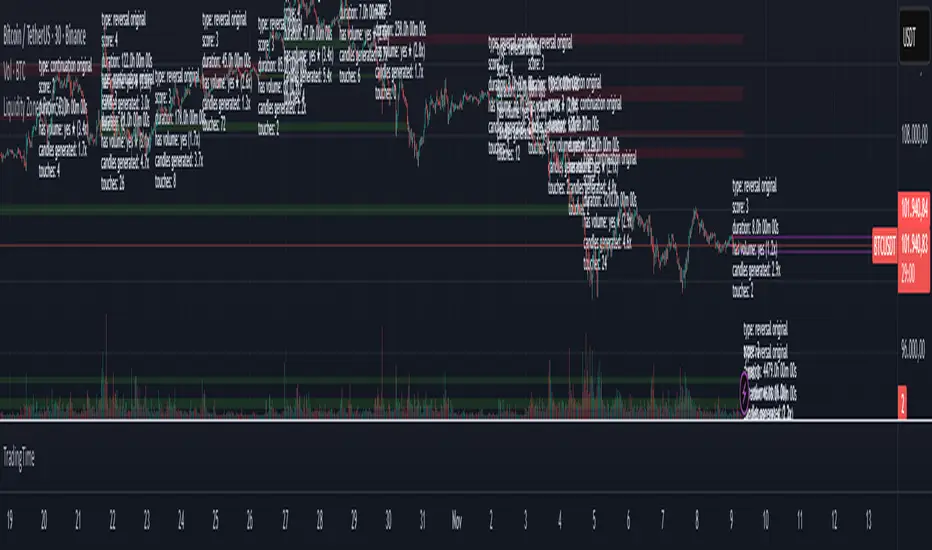 Liquidity Zones Pro automatically detects and maintains demand (potential support) and supply (potential resistance) areas across multiple timeframes. It tracks recent structure breaks, scores each zone, optionally reduces wide zones on a lower TF for precision entries, and colors candles by the macro trend so you trade in context.