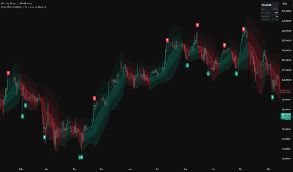HOAC includes an internal optimization layer that continuously measures how well each model fits current price action. On every bar, each model’s absolute deviation from the basis is recorded into a rolling memory window. The script then compares total accumulated error between fast and slow models and prefers the one with lower recent error.