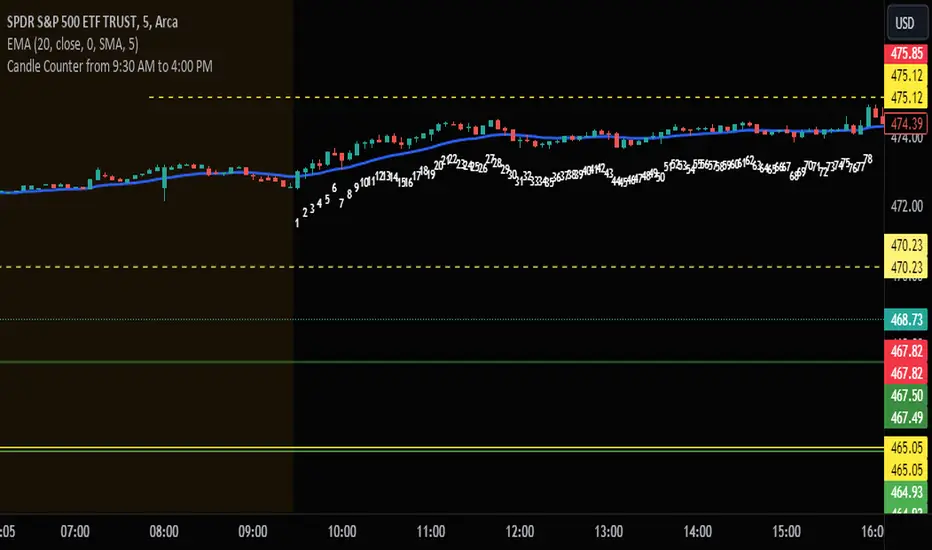 This Pine Script, designed for TradingView, serves as a candle counter exclusively for a 5-minute chart. It operates within the specific market hours of 9:30 AM to 4:00 PM. Key features of the script include: