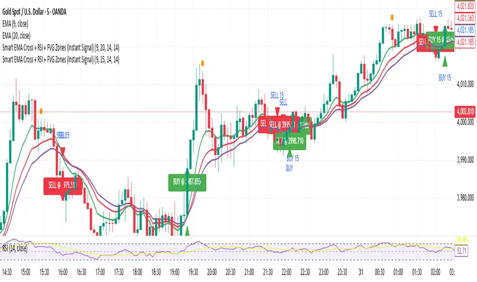 Smart 9-15 EMA Cross + RSI + FVG Zones (Instant Signal)