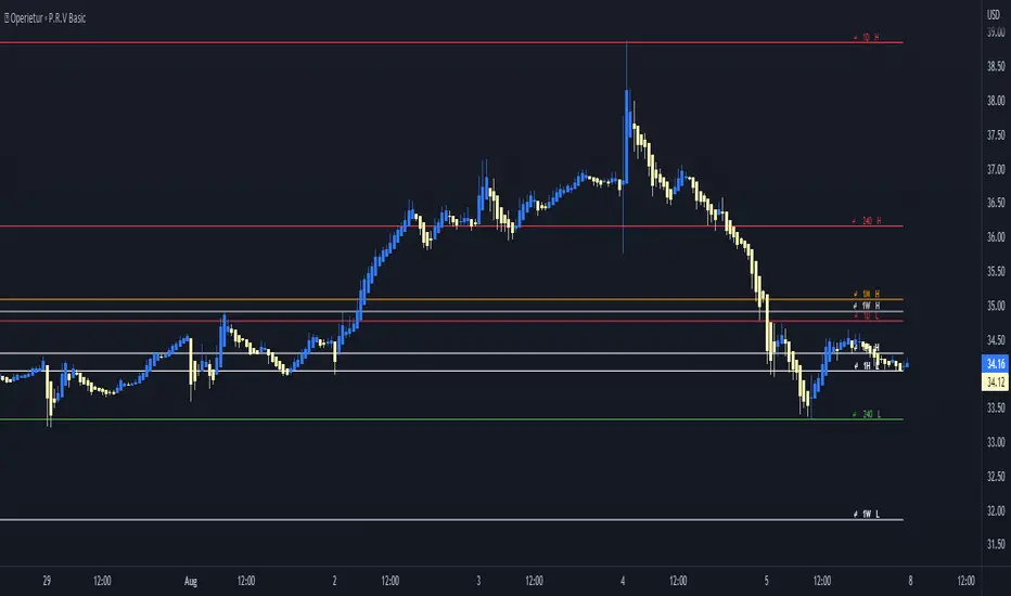 Our P.R.V (Previous Range Values)(Basic) indicator is pretty simple; it plots the previous ranges of the high/low for the structured timeframes. This helps to quickly identify the primary Historical supports and resistances according to the Gregorian time structure. Additionally, a 'custom' field allows for a wider selection other than the scripts default, however the custom selection uses the pre-defined timeframes opposed to manual inputs since the conversion is in minutes and would limit/cap the available range. The plotted lines are designed to remain "out of the way" from the current candle.