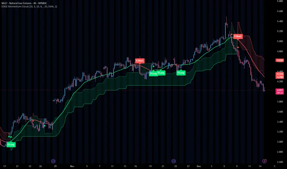 The EDGE Momentum Cloud is a confluence-based trading system that combines adaptive volatility zones with trend direction analysis to identify high-probability trade setups. Rather than relying on a single indicator, this tool creates a visual "momentum zone" that helps traders understand the current market regime while filtering signals through trend confirmation.