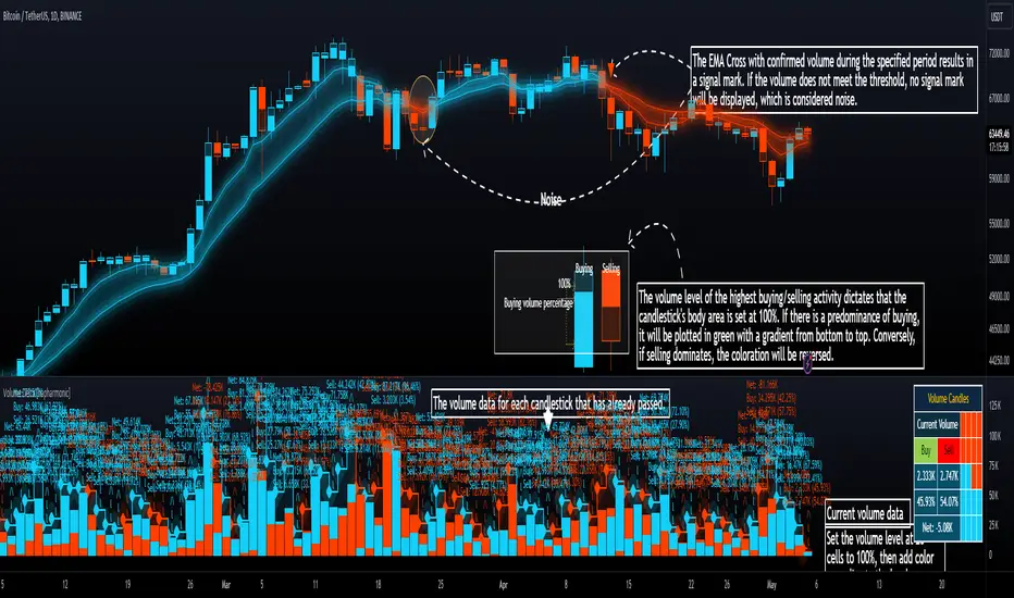 As you can see, the 12 and 26-day Exponential Moving Averages (EMAs) are used, with the Volume Confirmation Length set at 6. Therefore, the crossing of the EMAs proceeds normally, but it is highlighted with three triangular arrows to indicate a high likelihood of a valid crossover. However, if the volume is insufficient, these markers won't be displayed, although the EMA crossover will still occur as usual. This can be useful for using volume to verify the significance of the EMA crossover.