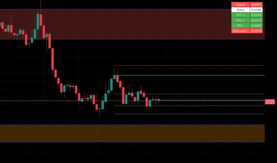 Detects trend bias shifts and automatically generates Entry, TP1–TP3 and SL based on impulse range projections. Targets update dynamically and wick-touch confirmation is used for accurate ✓ tracking.