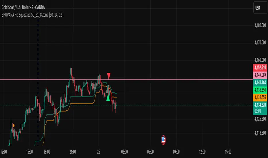 Visuals: Fib lines (50/61.8) + optional yellow zone highlight during squeeze.