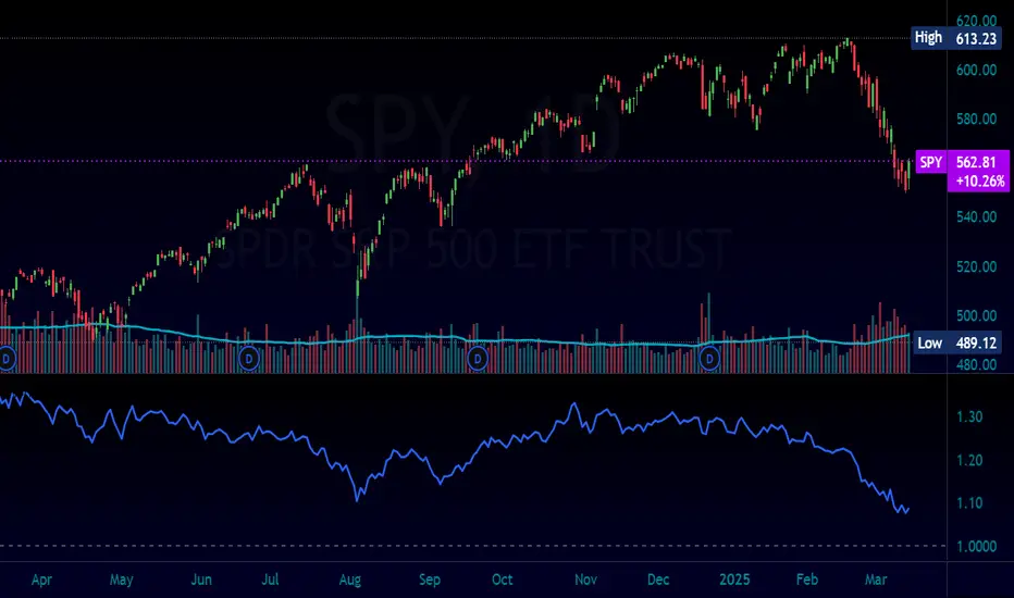 This indicator calculates a normalized equity-to-bond ratio over a 252-day lookback (~1 trading year) to assess risk-on vs. risk-off sentiment. It addresses the issue of direct ratios (e.g., SPY/TLT) being visually dominated by high nominal stock prices, which can obscure bond price movements.