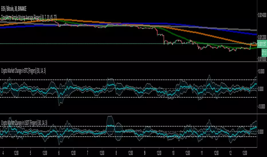Crypto Market Change provides an indication of whether the value of a basket of 19 coins traded in BTC on Binance (as of July 12, 2018) are headed up or down. A simple moving average of the percentage change in BTC price for each coin is calculated. The moving averages are then summed and displayed. A measure of price volatility of indicated by standard deviation bands. Period, moving average length, and number of standard deviations are adjustable.