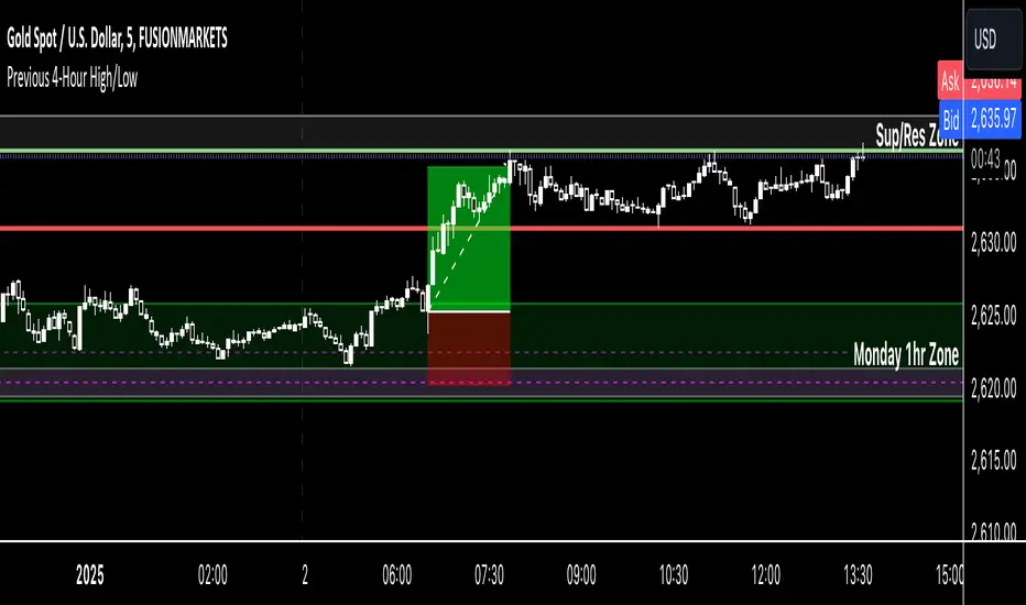 This indicator highlights the high and low levels of the previous candle from a user-defined timeframe (default: 4 hours) and extends these levels both to the left and right across the chart. It allows traders to visualize key support and resistance levels from higher timeframes while analyzing lower timeframe charts.