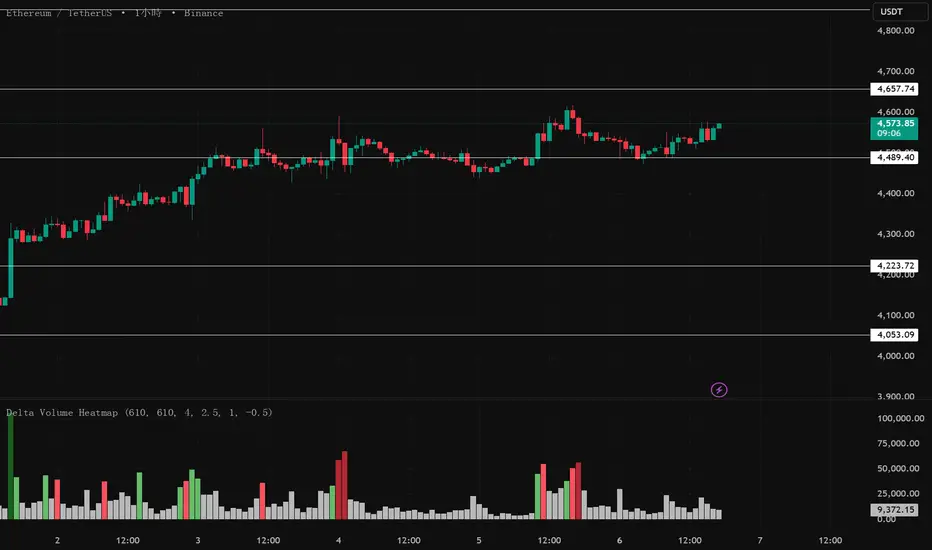 The Delta Volume Heatmap visualizes the real-time strength of per-bar delta volume — highlighting the imbalance between buying and selling pressure.