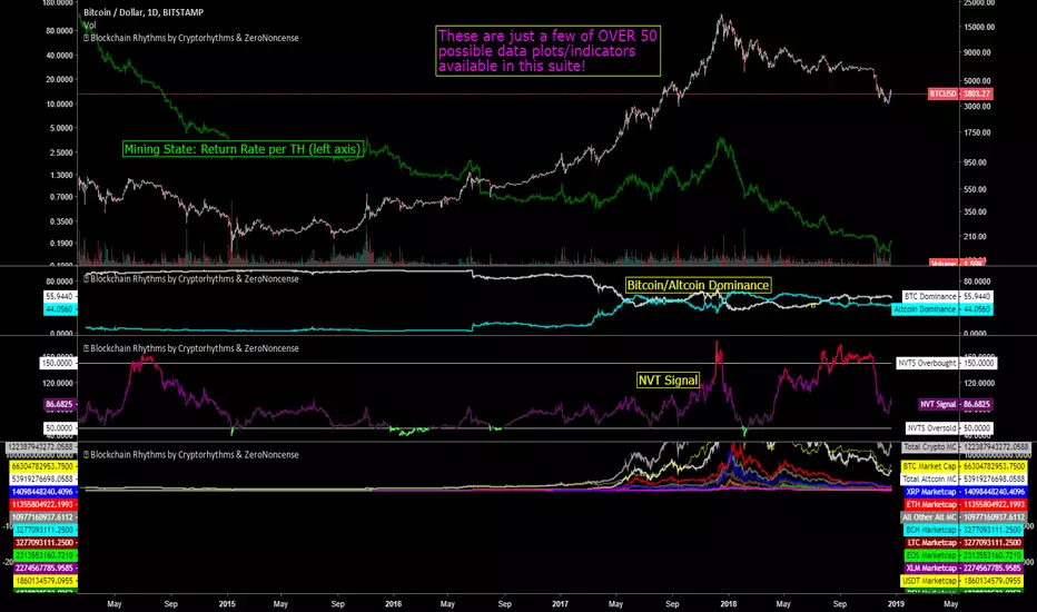 Blockchain Rhythms is a comprehensive data science suite that aggregates on-chain blockchain metrics, network statistics, and fundamental indicators into a single modular framework. Originally created by Cryptorhythms and ZeroNoncense, this version has been updated to Pine Script v6 with modern best practices.