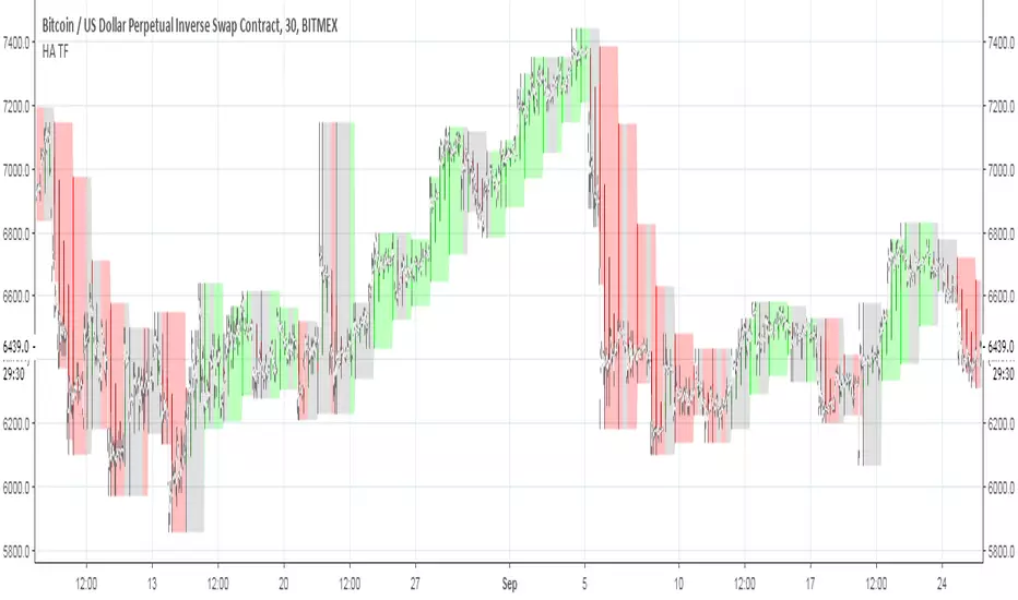 This script uses two higher TF Heikin-Ashi bar plots to determine the present trend. Green shading = bull; red shading = bear; grey shading = indeterminate. The HA candles from both TFs are also plotted.