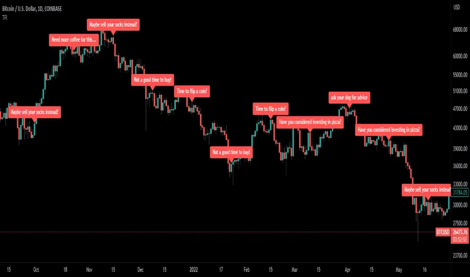 The script you're looking at is a humorous "financial advisor" that places funny and non-traditional investment advice labels on a trading chart. The advice doesn't really have any meaningful connection to real financial indicators or market trends, and it's meant for entertainment purposes only.