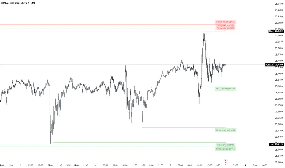 A clean, no-repaint indicator that marks unmitigated RTH (Regular Trading Hours) Highs and Lows. This indicator automatically tracks daily NYSE RTH session highs and lows, then draws them as horizontal levels that persist until price taps (mitigates) them.