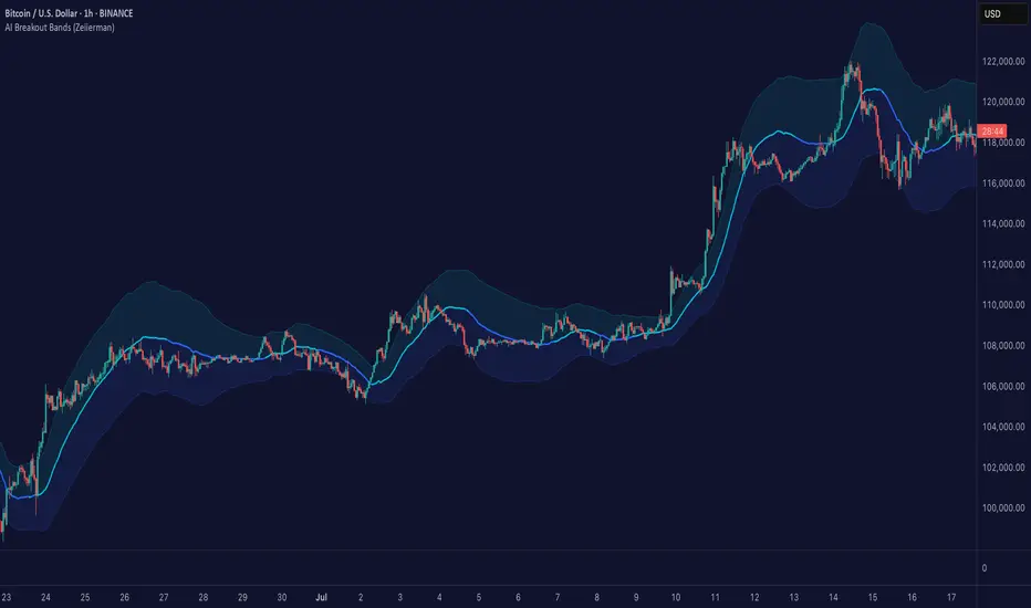 AI Breakout Bands (Zeiierman) is an adaptive trend and breakout detection system that combines Kalman filtering with advanced K-Nearest Neighbor (KNN) smoothing. The result is a smart, self-adjusting band structure that adapts to dynamic market behavior, identifying breakout conditions with precision and visual clarity.