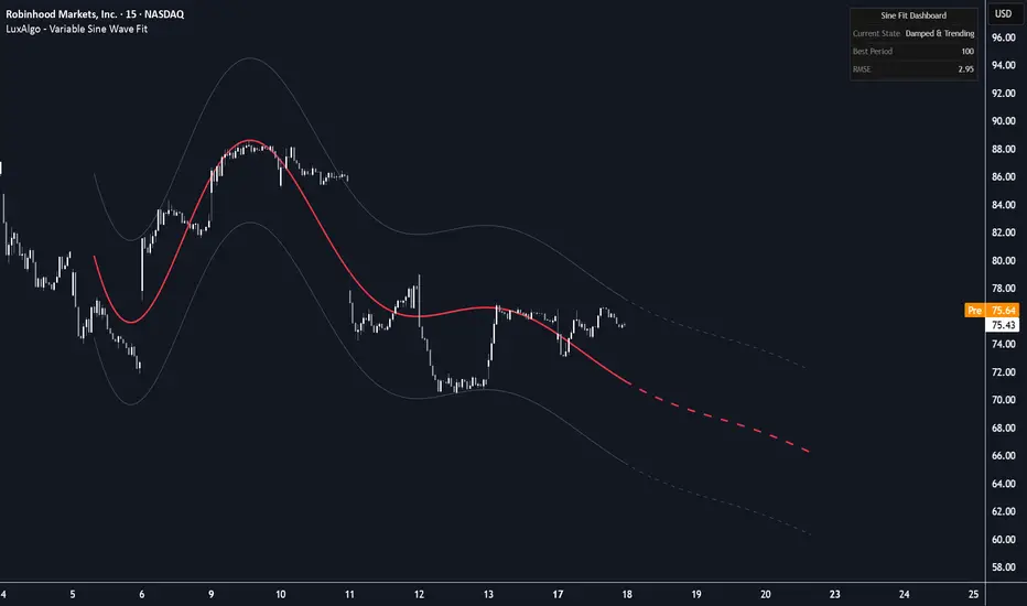The Variable Sine Wave Fit indicator uses Ordinary Least Squares (OLS) to fit a dynamic, damped, or expanding sine wave with an underlying linear trend to recent price action. This tool aims to identify cyclical patterns and project their potential continuation into the future, providing a mathematical framework for understanding market regimes and turning points.