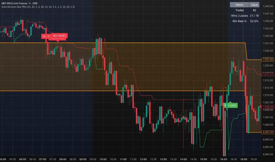 Auto Decision Box PRO is a rule-based market structure framework that identifies balance, expansion, breakout continuations, and failed breakout reversals using adaptive volatility and higher-timeframe structure logic.