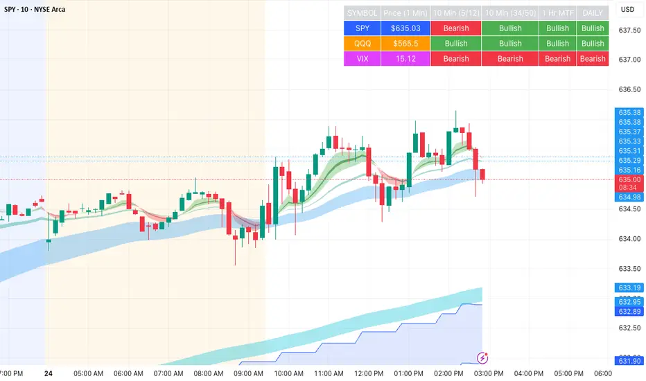 ***CURRENTLY IN BACKTESTING PHASE***This TradingView script creates a real-time multi-timeframe trend status table for SPY, QQQ, and VIX using the Ripster-style EMA cloud logic.