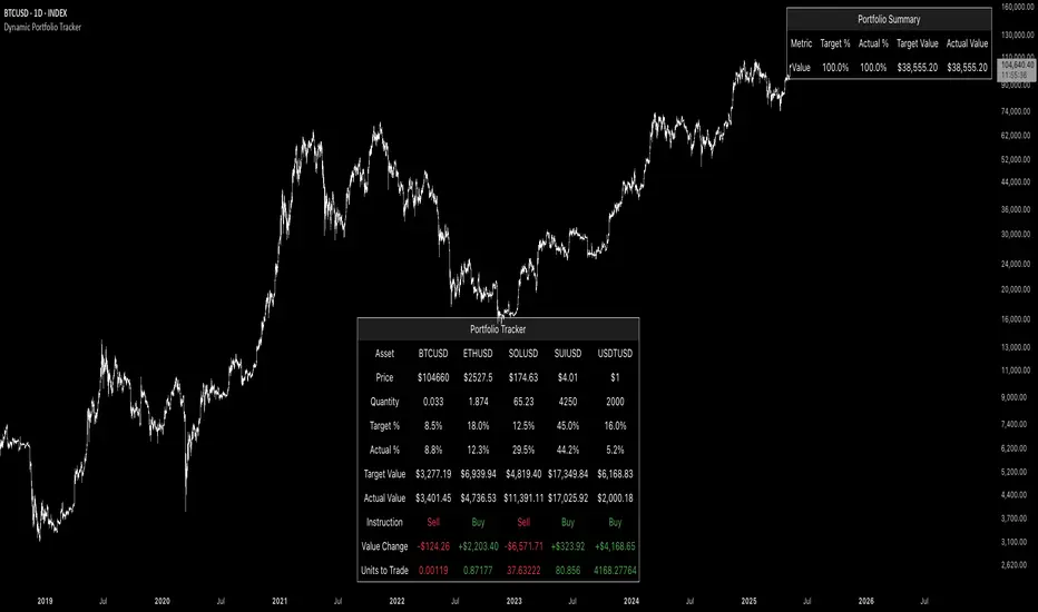 Dynamic Portfolio TrackerThe Dynamic Portfolio Tracker is a visual tool for actively managing and monitoring a multi-asset portfolio directly on TradingView. It allows users to input up to 15 custom assets (with a default setup for 5), define how much of each asset they hold, and assign a target allocation percentage to each. The script then calculates live market prices, total portfolio value, current vs. target weightings, and provides clear, color-coded instructions on whether to buy, sell, or hold each asset. It displays all this data in an on-chart table, showing both the dollar amount and the quantity to adjust for each asset, helping users keep their portfolio aligned with their strategy in real time.
