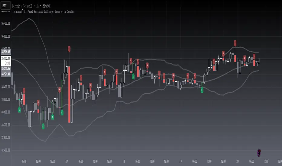 OVERVIEWThe [blackcat] L1 Pawel Kosinski Bollinger Bands with Candles indicator combines Bollinger Bands with candlestick patterns to provide traders with enhanced visual cues for potential buy and sell opportunities. This script calculates Bollinger Bands using user-defined inputs and identifies specific candlestick patterns, such as bullish engulfing patterns and Bollinger Band triggers. It colors bars accordingly and plots labels on the chart for easy identification of these patterns 📈🕯️.