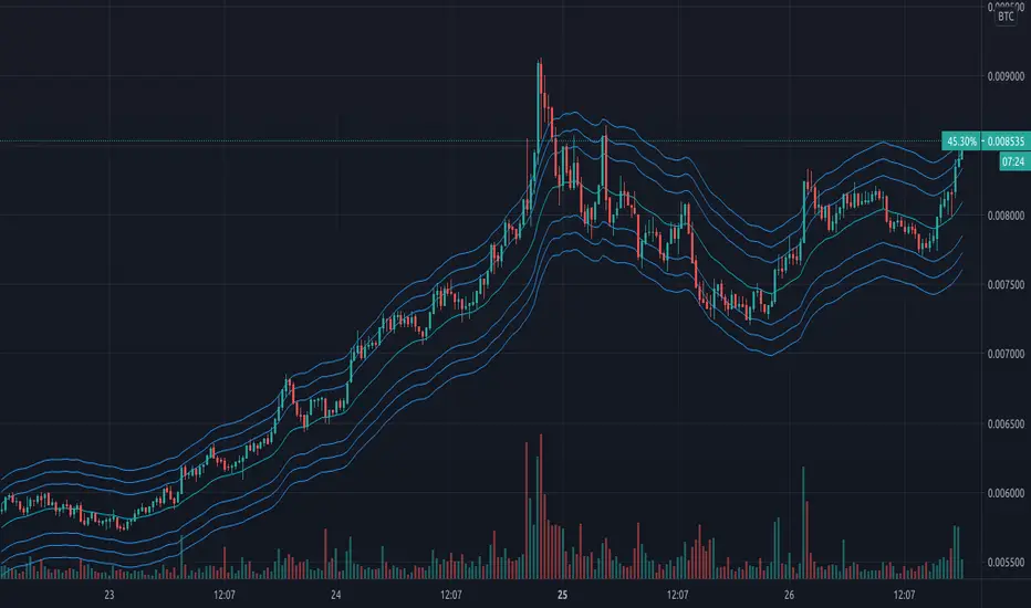 This indicator plots displaced EMA values guggesting possible sell targets. EMA is displaced by a given target profit.