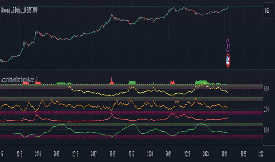 Updated accumulation/distribution bands now also includes a modified pi cycle top indicator which is used for both sell and buy signals. Additionally some parameters were readjusted.Buy or sell a certain percentage (up to you to decide the exact value) of your BTC weekly depending on the intensity of accumulation/distribution signals!