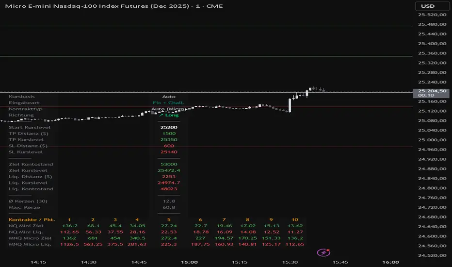 Fix + Challenge Mode: TP/SL are entered manually (in points, ticks, or dollars), while the global challenge levels (target and liquidation) are shown for context. This mode is ideal for trades with a fixed risk-reward ratio. The display — combined with the Candle Size Monitor — helps assess whether the planned trade aligns with current market conditions and the status of the challenge.