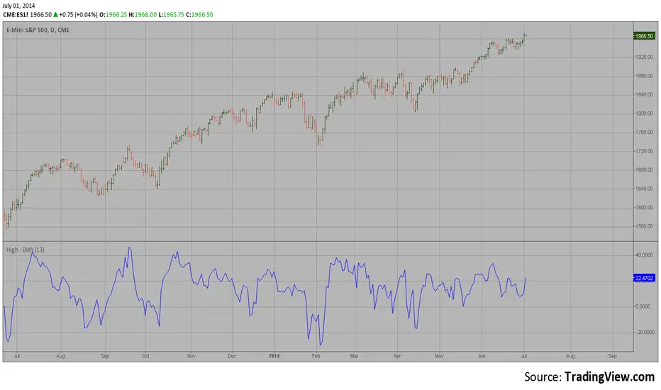 and an exponential moving average (13 period) of the Close (of the previous period).
