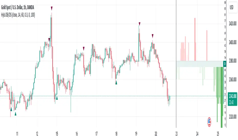This is a new representation of my well-known oscillator Hybrid Overbought/Oversold Detector overlaid on the chart. The script utilizes the following 12 different oscillators to bring forth a new indicator which I call it Hybrid OB/OS.