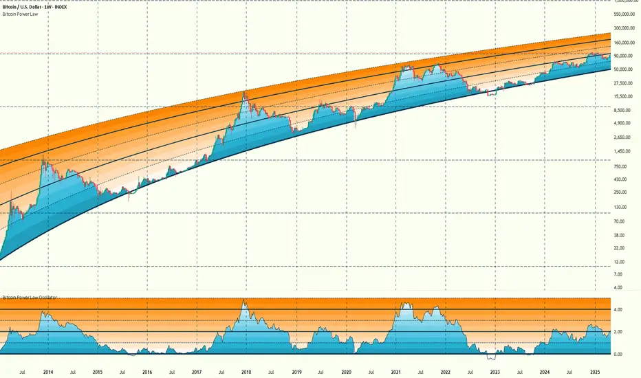 By fitting a power law to historical data, the model creates a trend line that represents this growth. It then generates additional parallel lines (support and resistance lines) to show potential price boundaries, helping to visualize where Bitcoin’s price could move within certain ranges.