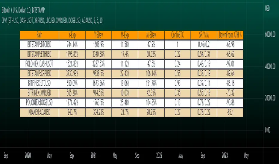 This is yearly expected return of the asset. It is simply the mean of the yearly returns of the asset. (these calculations are not typical in Tradingview because mainly we calculate on each bar and give value at the same bar but here this value to change once a year). Remember that the higher this value is the better it is because historically the asset have shown good returns but there is a tip: Always check the available historical data in any asset that you are adding if you add an asset that has only 1 year of data available or you use an exchange data that recently added the coin you will get unsignificant results and the results can not be trusted. You should always selects coins and market (coins can be changed in setting) that have the largest data available.