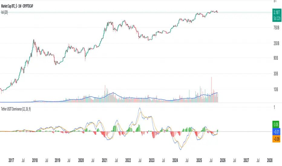 This indicator displays Tether (USDT) dominance as a MACD-style oscillator, using data from the CRYPTOCAP:USDT.D symbol. It includes: