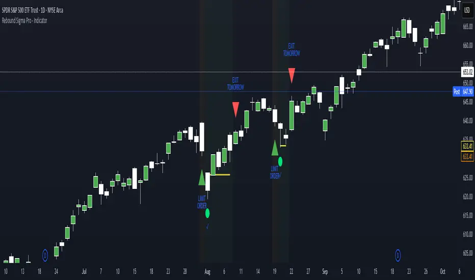 Rebound Sigma Pro is a mean-reversion indicator that detects statistically oversold conditions in trending markets.