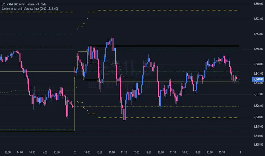 This indicator automatically plots crucial price reference points for the Regular Trading Hours (RTH) session, including Yesterday's High/Low/Close, Session Open, Midpoint, and the Initial Balance (IB) range with its 2x extension.