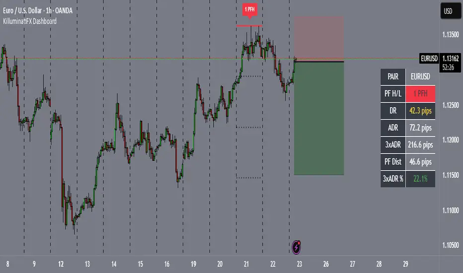 The KilluminatiFX Dashboard is designed to help traders visually track key Market Maker concepts such as Peak Formations, Daily Range (DR), Average Daily Range (ADR), and ADR projections — all in one compact table, aligned with your chart in real-time.