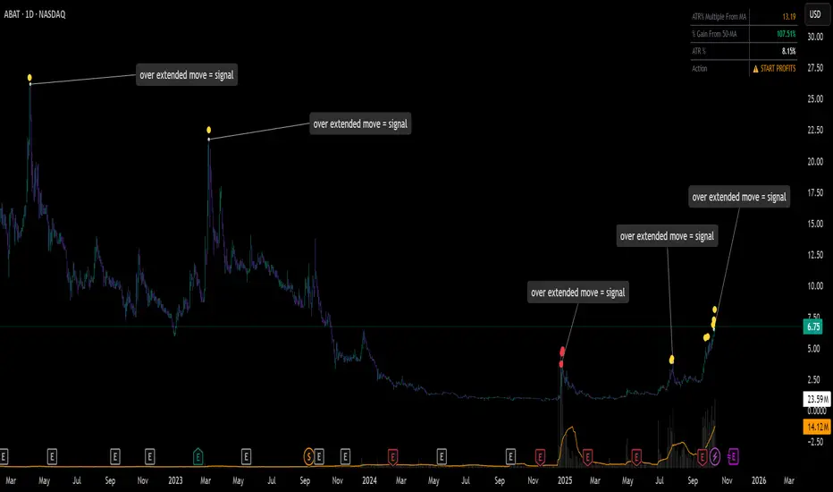This overlay indicator identifies overextended price moves by calculating how many ATR% multiples price is away from a moving average, providing objective profit-taking signals.