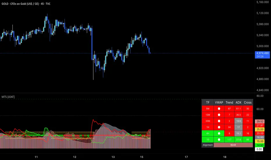 The indicator addresses a critical trading challenge: signals that look strong on one timeframe often fail because higher timeframes are moving in the opposite direction. By analyzing 15-minute, 1-hour, and 4-hour timeframes simultaneously while monitoring current timeframe momentum, this tool helps traders avoid counter-trend trades and identify high-probability setups where multiple timeframes align.