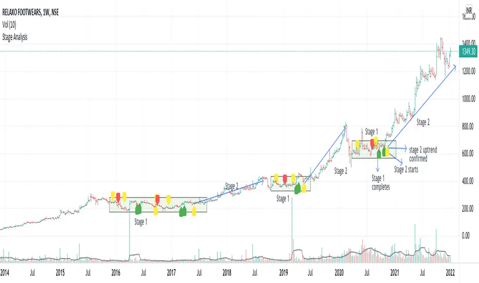 This indicator helps in identification of stage cycle of a stock. Only to be analysed on Weekly and Daily timeframe.