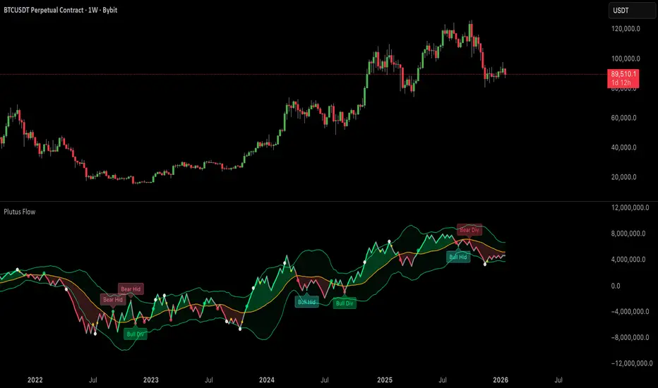 Plutus Flow transforms raw On-Balance Volume (OBV) into a filtered, statistically-bounded oscillator with automatic divergence detection. The indicator is designed to help traders analyze cumulative buying and selling pressure through three integrated analytical layers: spike-clipped volume accumulation, standard deviation banding, and pivot-synchronized divergence detection.