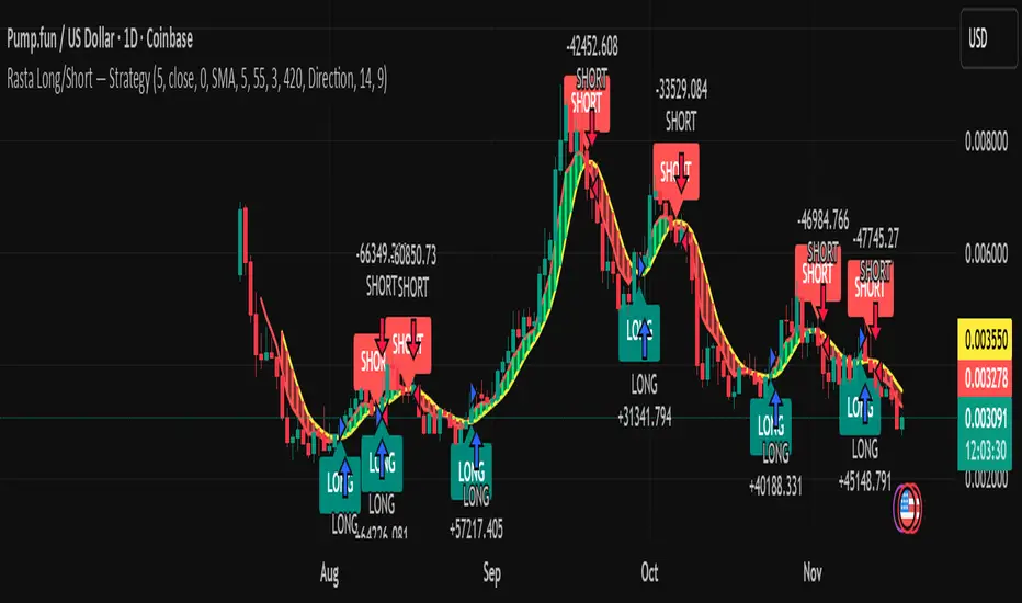 The Rasta Long/Short Strategy is a visual and educational framework designed to help traders study momentum shifts that appear when a fast EMA interacts with a slower smoothed baseline.