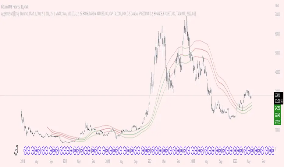 The "AggBands" indicator is a custom trading indicator designed to provide a consolidated view of the price action across multiple assets or trading pairs. It combines the price data from multiple tickers and calculates an aggregated price using user-defined weights for each ticker.
