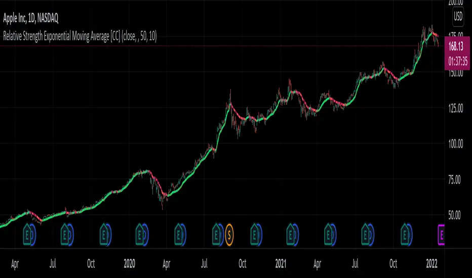 The Relative Strength Exponential Moving Average was created by Vitali Apirine (Stocks and Commodities Jan 2022 pgs 22-25) and this is a handy moving average that combines a typical overbought/oversold mechanic with an overall trend indicator. Even though the typical length is so large it reacts extremely quickly when the stock becomes overbought or oversold. Because of this the indicator by itself doesn't work as well during choppy periods so Vitali recommends using a moving average crossover system during choppy so do one indicator with the default length of 50 and use a different length of 10 so when the shorter length crosses over the longer length then buy and vice versa you would sell. Generally speaking buy when the line turns green and sell when it turns red. I have used strong buy and sell signals in addition to normal signals so strong signals are darker in color and normal signals are lighter in color.