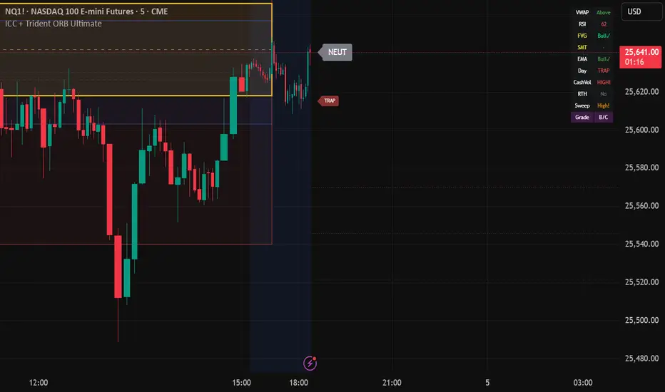 This tool is an intraday framework built around ICT-style Indication → Correction → Continuation (ICC) logic, using three coordinated Opening Range Boxes (“Trident ORB”) plus a confluence engine to grade breakouts and reversals.