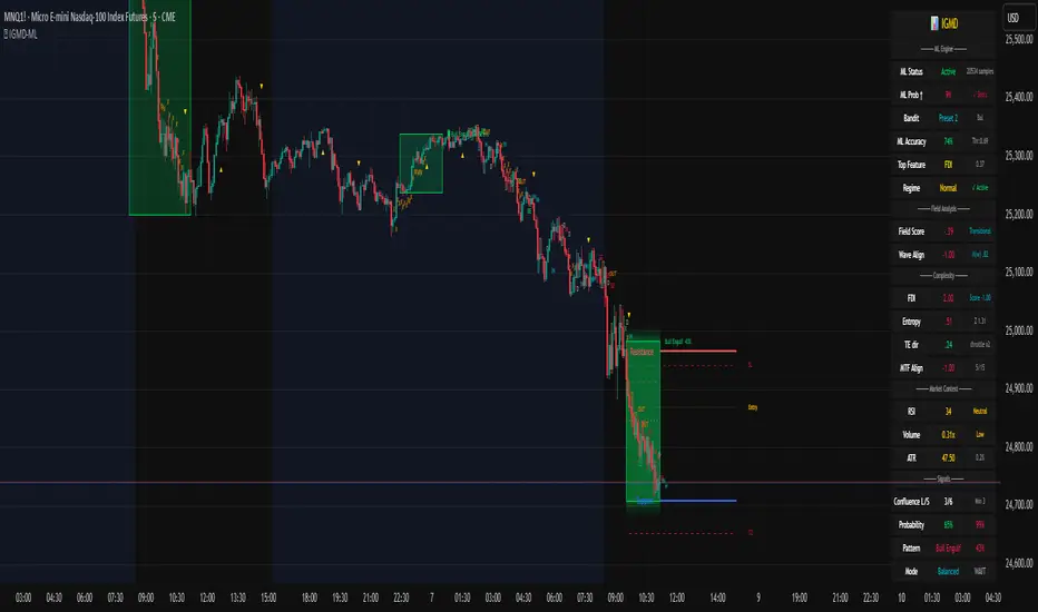 This version of IGMD introduces a significant advancement: an integrated machine learning (ML) engine that acts as an intelligent decision-making layer on top of the core five-kernel analysis. This is not a "black box" system but a transparent, adaptive filter designed to improve signal quality by learning from the market in real time.