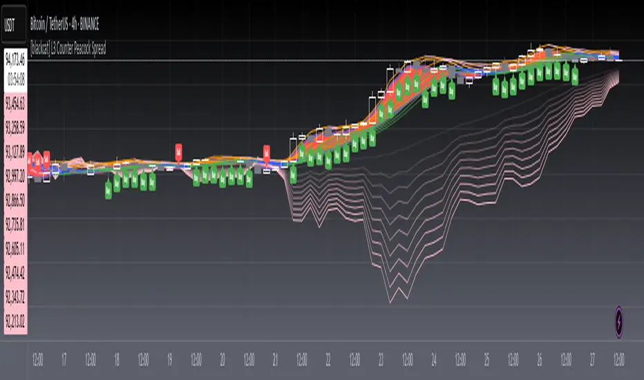 OVERVIEW The L3 Counter Peacock Spread indicator is a comprehensive trading tool that combines multiple moving averages, weighted moving averages, and K-line analysis to identify potential entry points in the market.FEATURES