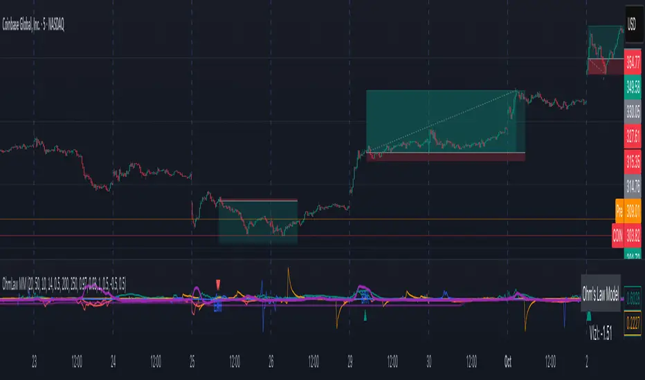 This indicator applies the concept of Ohm's Law from physics to the financial markets, creating a model to analyze market dynamics as if they were an electrical circuit.